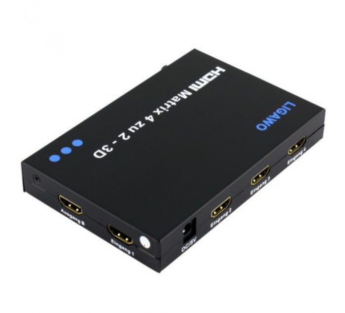Ligaweon laadukas ja pienikoinen HDMI-matriisi. Voit kytkeä neljä kuvanlähdettä matriisin, ja signaali menee kahdelle laitteelle. Jos sinulla on kytkettynä tulolähteinä DVD-soitin, Playstation 3 ja tietokone matriisiin ja televisio ja videotykki, voit katsoa DVD:tä televisiolla samalla kun pelataan Playstationilla. Pienen koonsa takia voidaan sijoittaa minne tahansa. Voit valita joko itse laitteesta tai kaukosäätimellä mitkä kuvat näkyvät missäkin televisiossa. Laitteessa löytyy LED:it mitkä näyttävät mitkä sisääntulot- ja ulostulot ovat aktiivisia. Laite tukee myöskin ääntä, ja laitteessa on sekä optinen Toslink-ulostulo että 3,5mm stereo-liitin. Matriisissa on 3D-tuki. Ideaalinen laite kotiteatteriin, yrityksille, kouluihin ym.