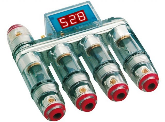 Sulakepesä AGU-sulakkaille, jonka LED-näyttö näyttää jännitteen.